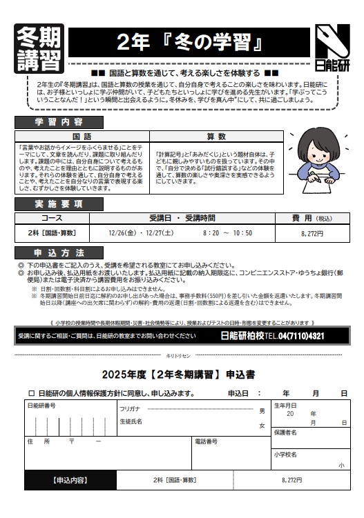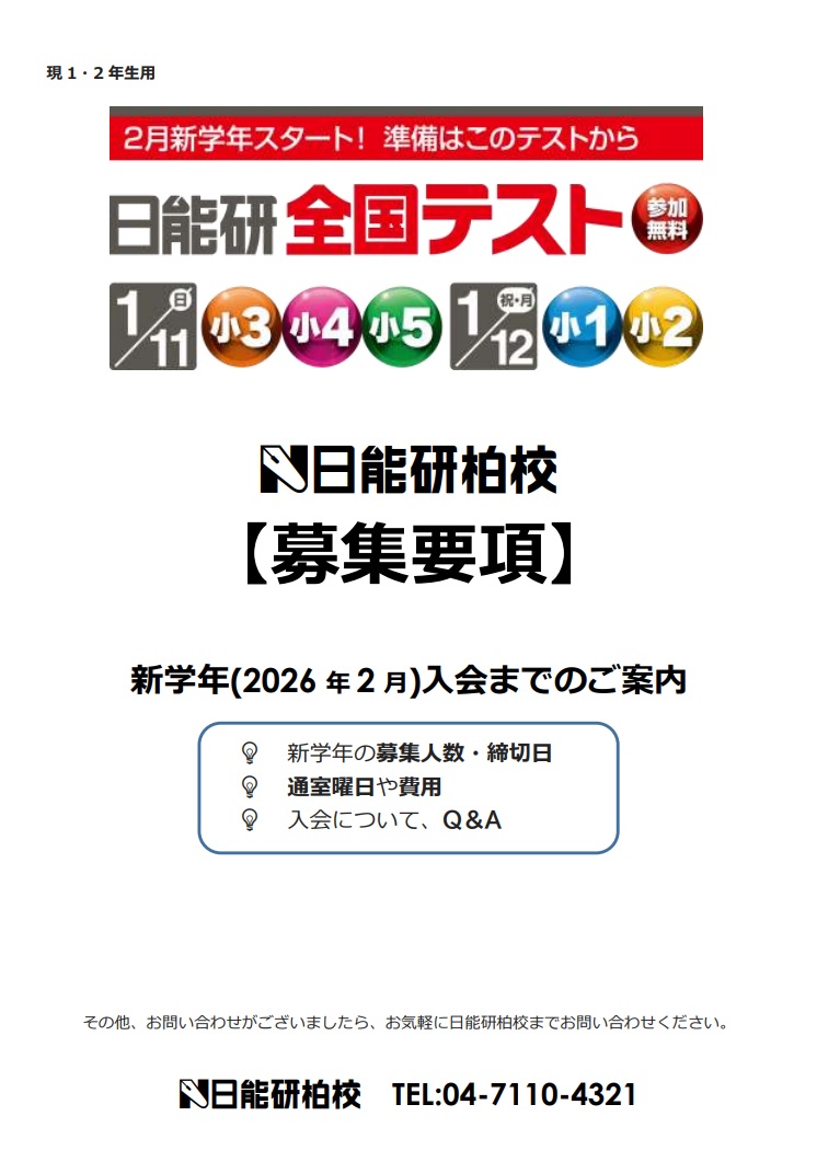 日能研柏校では、1月11日(日)に3〜5年生を対象に、1月12日(月・祝)に1・2年生を対象に全国テストを実施いたします。